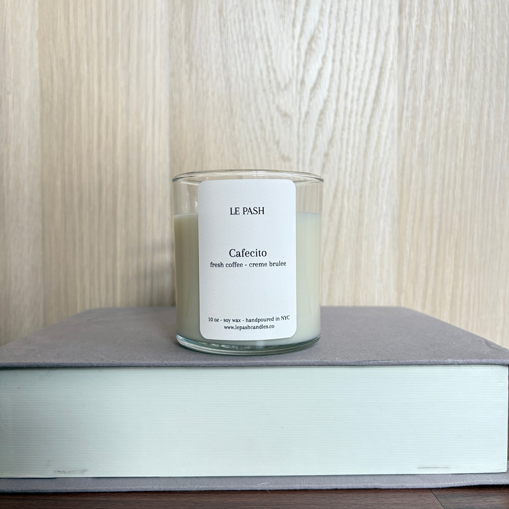 10oz - clear jar - bronze lid - fresh coffee beans on top of candle.